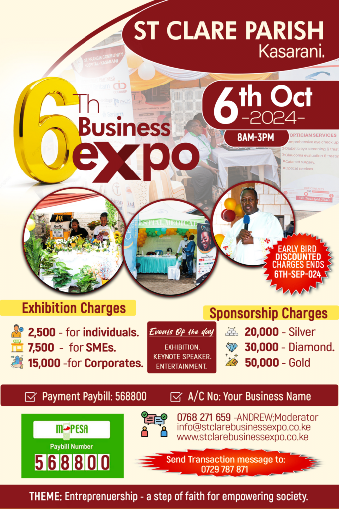 ST. CLARE BUSINESS EXPO Faith & Networking THE 6TH EDITIONThis is yet another chance for you to showcase what you do to thousands of Christians, across all demographics. One day at the St. Clare Business Expo could change the trajectory of your brand and business. Got for it! Want to sponsor? Book Here Want to exhibit? Book Here ABOUT USAt. St. Clare Parish, Kasarani, we empower our members (and even non-members) to showcase their businesses. Reach OutHave any questions? Talk to the committee now.GET IN TOUCH
